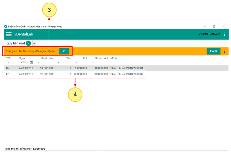 4: Thông tin quỹ tiền mặt mỗi khi thực hiện thu/chi sẽ được hiển thị theo từng dòng, bao gồm STT, Ngày, Số dư đầu, Thu, Chi, Số dư cuối, Mô tả.